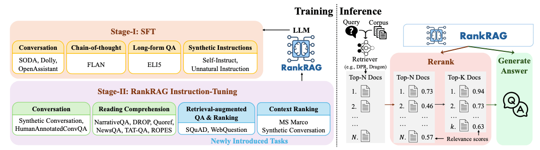 RankRAG, is a groundbreaking Retrieval-Augmented Generation (RAG) framework that instruction-tunes a single large language model (LLM) for both top-k context ranking and answer generation. By integrating a small portion of ranking data into its training blend, RankRAG excels in context ranking, outperforming existing expert models, including the same LLM fine-tuned exclusively on extensive ranking data.